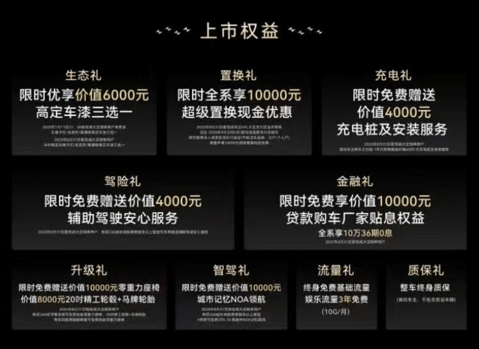 升级礼:限时免费赠送价值10000元零重力座椅;价值8000元20时精工轮毂+马牌轮胎
