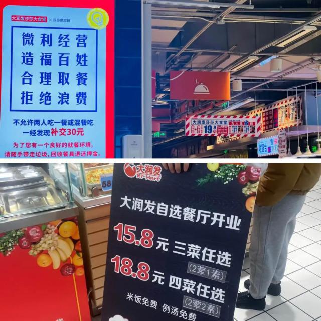 大润发则在北京西红门店内开设了大润发莎莎大食堂,主打自助模式,19.9 元 60 余种餐品,包括荤菜、素菜、主食、水果、凉菜、甜点等,占地面积接近 200 平方米,就餐区可同时容纳 80 人就餐。