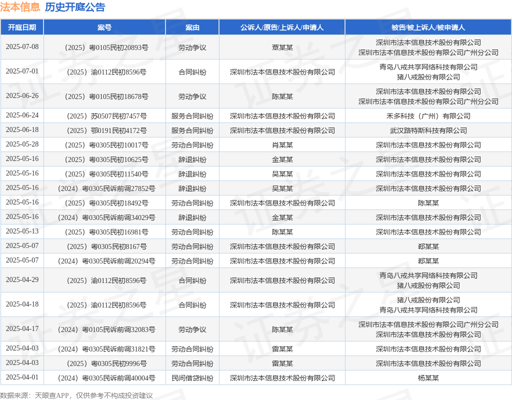 案号:(2025)鄂0191民初4172号审理法院:武汉经济技术开发区人民法院案由:服务合同纠纷当事人信息: 原告/上诉人:深圳市法本信息技术股份有限公司 被告/被上诉人:武汉路特斯科技有限公司开庭日期:2025年6月18日根据统计,近一年内以深圳市法本信息技术股份有限公司为当事人的历史开庭公告有52则,其中案由为“劳动争议”的公告以12则居首,其次为“劳动合同纠纷”有10则,“服务合同纠纷”有9则。历史开庭公告(前20条)如下: