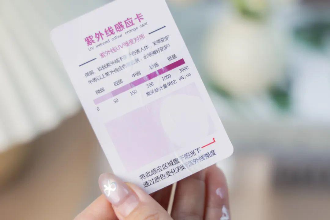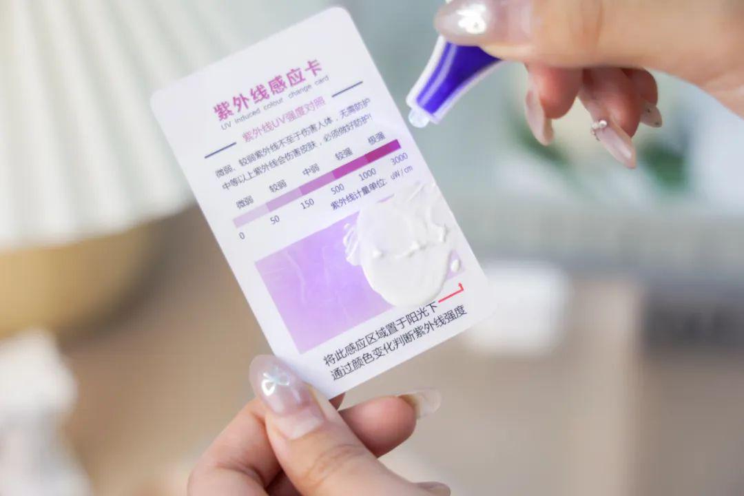 在紫外线测试卡涂上晶感防晒乳用紫外线灯强力照射,可以看见防晒霜均匀防晒,实力守护!