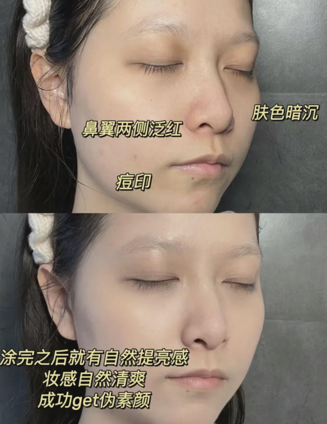 抹匀后还有自然提亮肤色的效果,妆感透明,这效果足以媲美素颜霜!!!