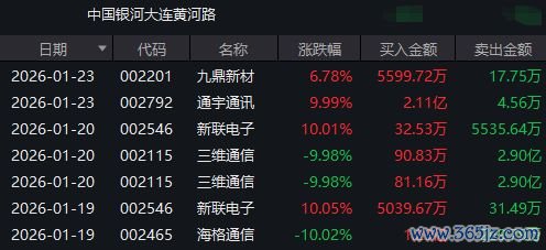 1月23日,中国银河证券大连黄河路营业部买入通宇通讯2.11亿元,买入九鼎新材5599万元。