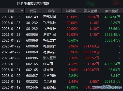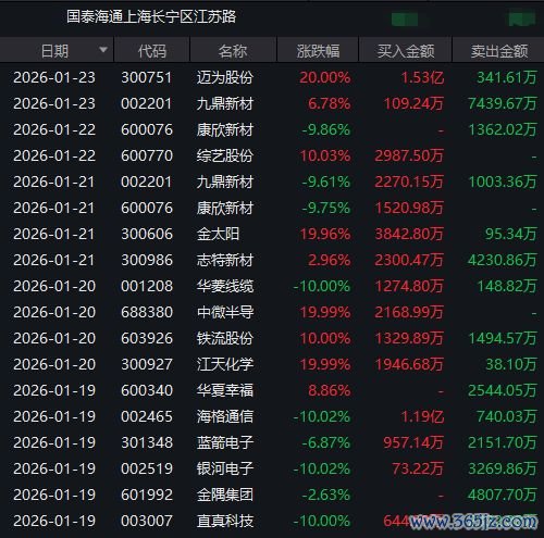 1月21日,国泰海通上海长宁区江苏路营业部买入志特新材2300万元,志特新材4230万元。同日,该席位买入金太阳3842万元并卖出95万元,买入九鼎新材2270万元并卖出1003万元。