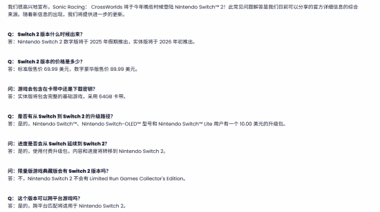 标准版售价69.99美元,豪华版售价89.99美元。拥有初代Switch版游戏的玩家,可补10美元的差价升级至Switch2版。升级游戏时,原有游玩数据会一并转移。
